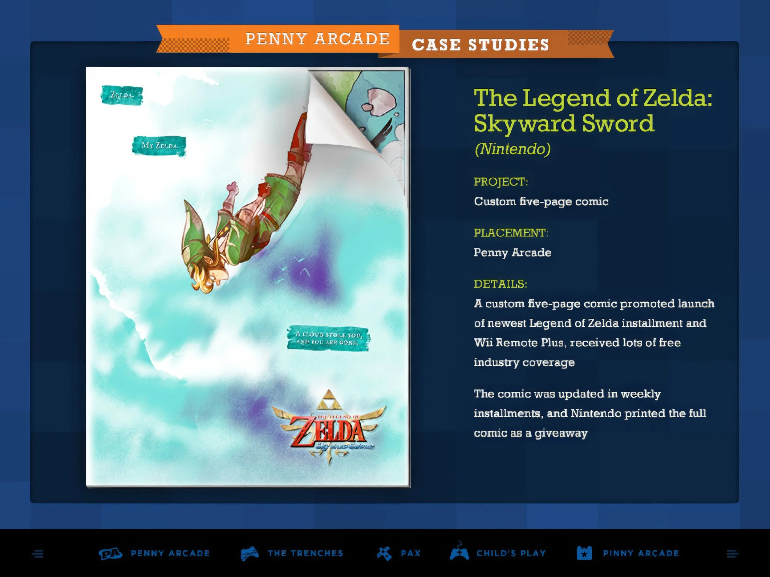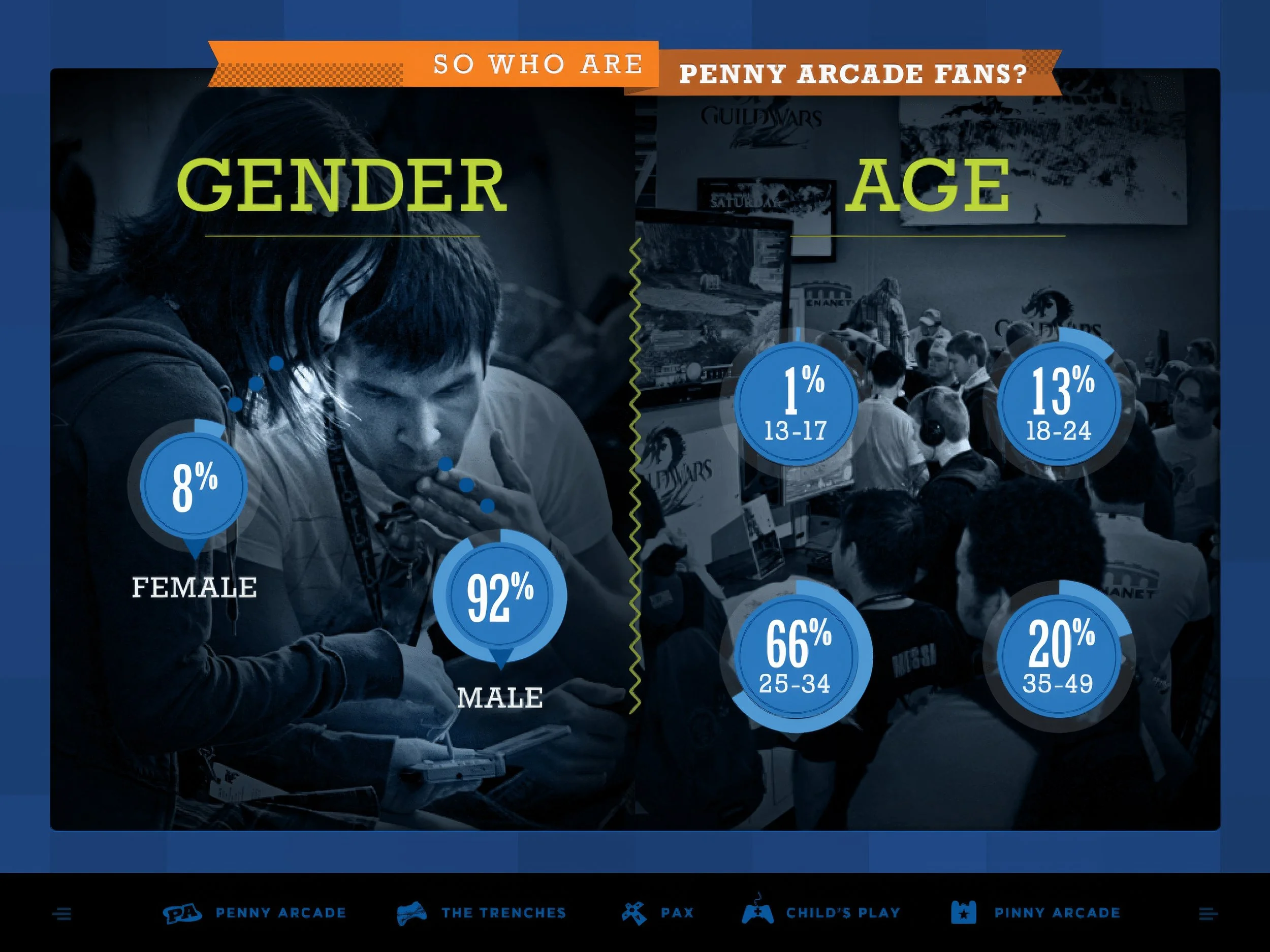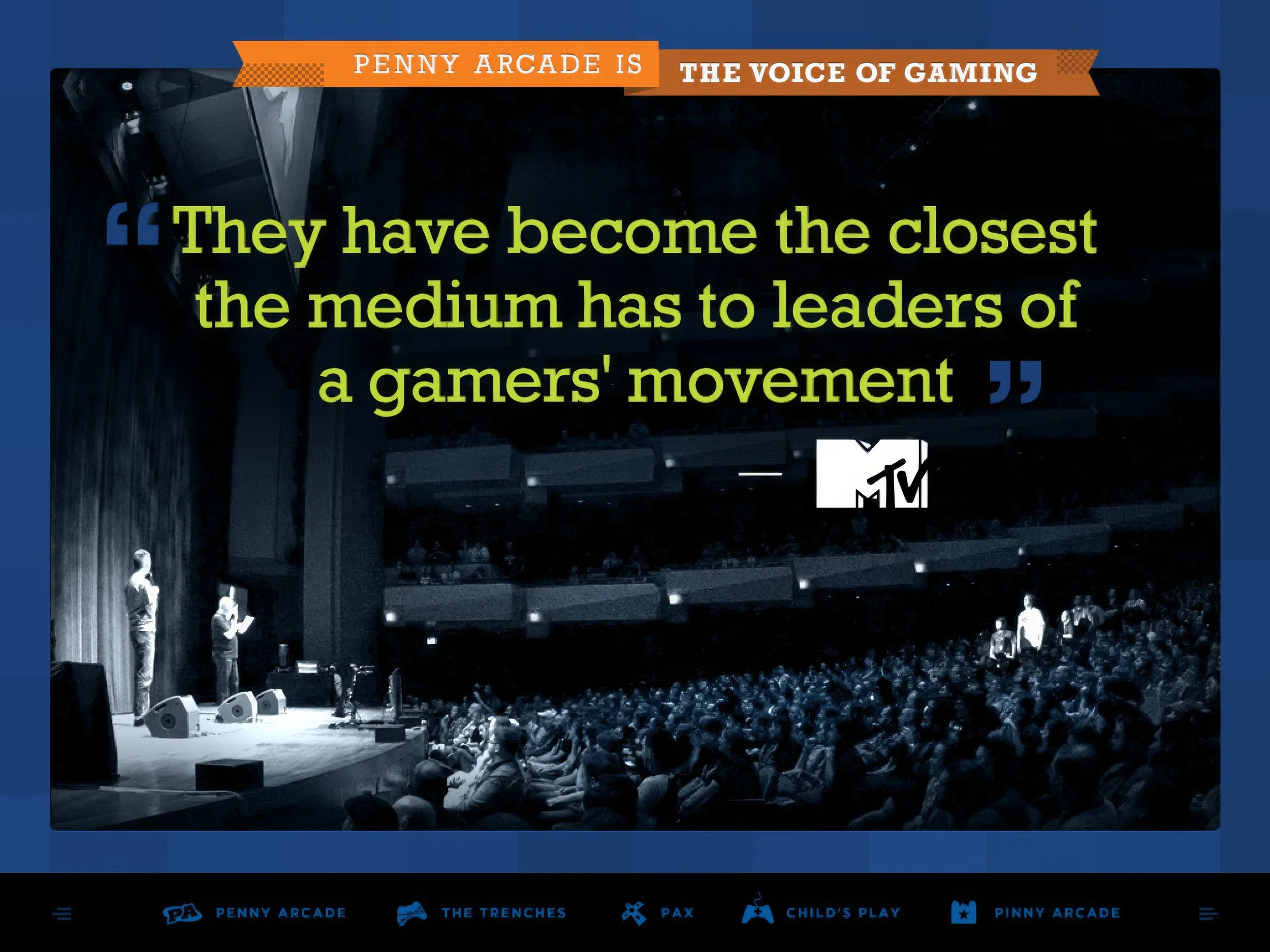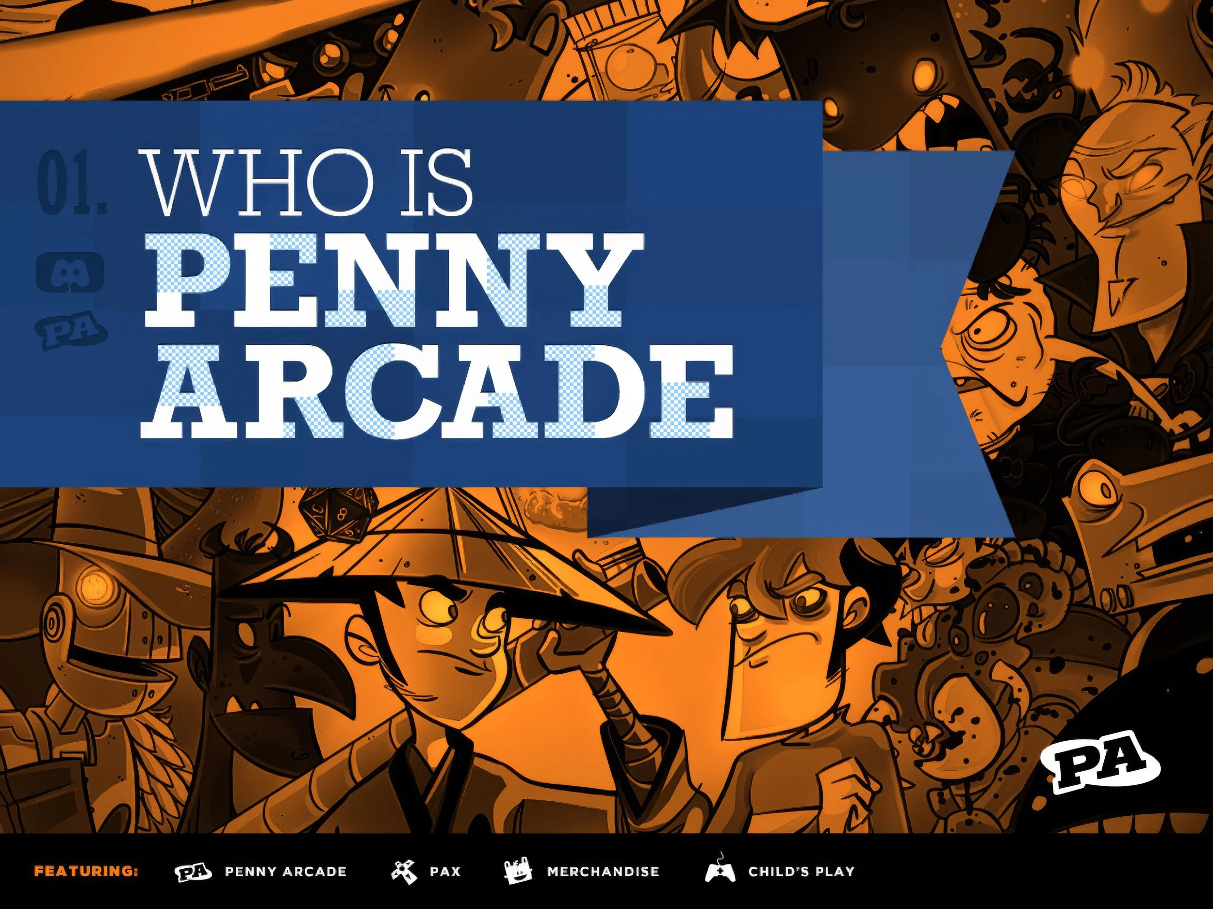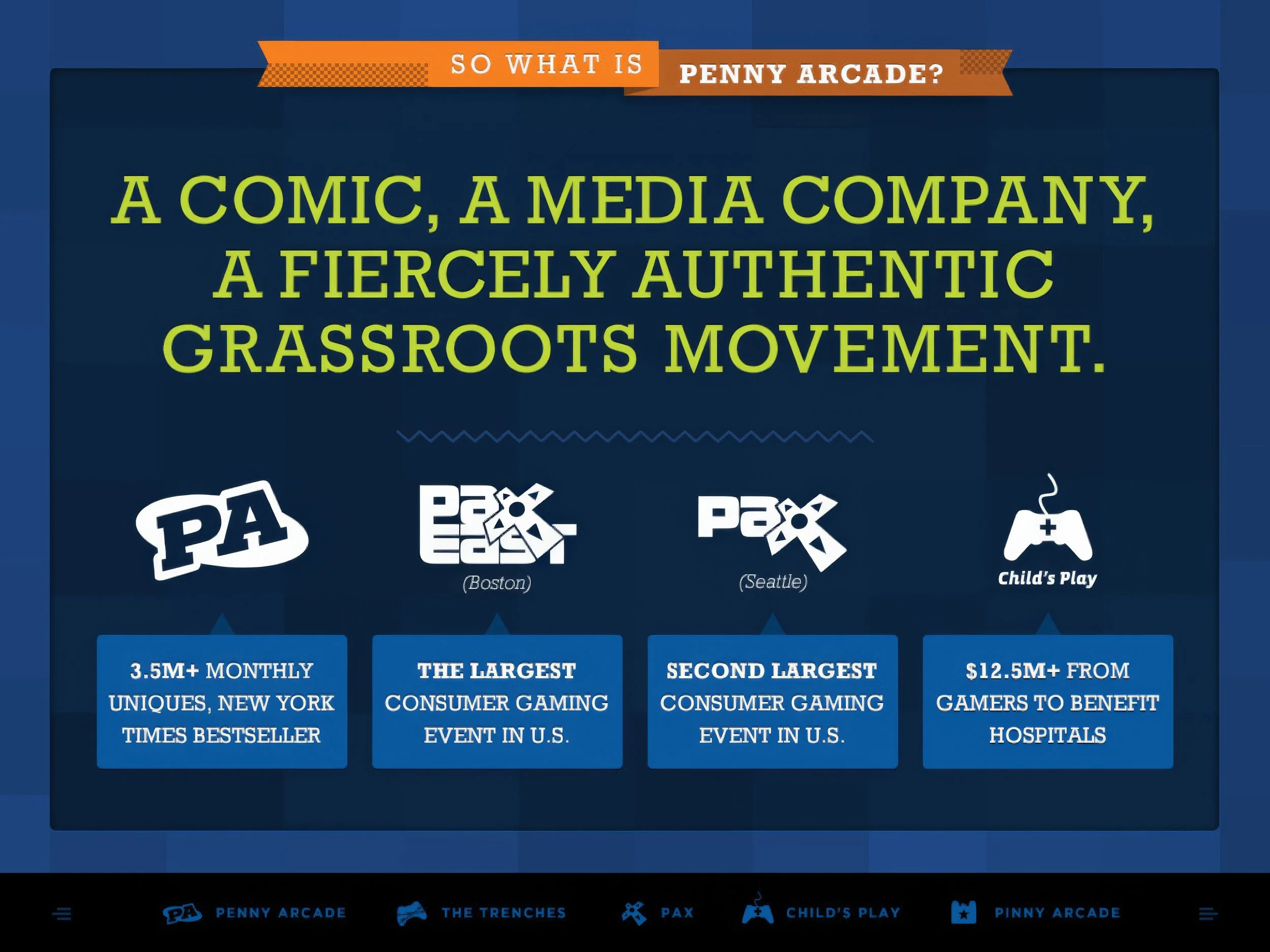 Penny Arcade is an entertainment media company with various properties, including the Penny Arcade comic, PAX, PATV, PA Report, The Trenches, and Child’s Play.